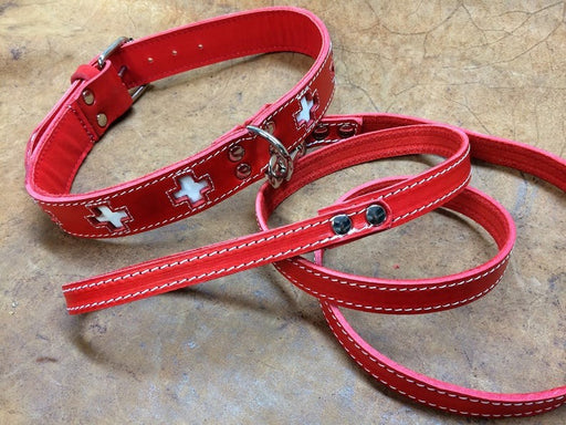 Collare e guizaglio per cane Modello San Bernardo in cuoio rosso e pelle bianca