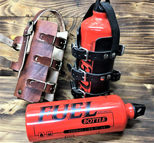 Porta borraccia per benzina 1L., petrol bottle holder, in cuoio 4 mm. Regolabile per moto custom Made in Italy Su: PB03 Brand: PACH PRODUCTION SHOP...